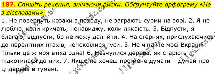 Спишіть речення, знімаючи риски. Обґрунтуйте орфограму «Не з дієсловами». 1. Не повернуть козаки з походу, не заграють сурми на зорі. 2. Я не люблю, коли кричать, ненавиджу, коли лякають. 3. Відпусти, я благаю, відпусти, бо не можу далі йти. 4. На стернях, прислухаючись до перелітних птахів, непокоїлися гуси. 5. Не чіпайте моєї Вкраїни! Тільки це ж моя втіха одна! 6. Незчулися дерева, як старість підкотилася до них. 7. Якщо не хочеш про мене думати – думай про ці дерева в тумані.