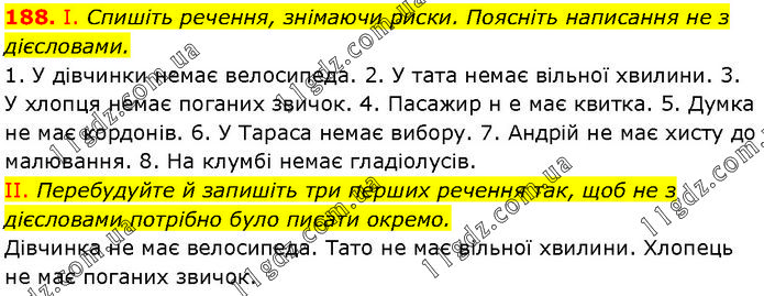 І. Спишіть речення, знімаючи риски. Поясніть написання не з дієсловами. 1. У дівчинки немає велосипеда. 2. У тата немає вільної хвилини. 3. У хлопця немає поганих звичок. 4. Пасажир н е має квитка. 5. Думка не має кордонів. 6. У Тараса немає вибору. 7. Андрій не має хисту до малювання. 8. На клумбі немає гладіолусів. II. Перебудуйте й запишіть три перших речення так, щоб не з дієсловами потрібно було писати окремо. Дівчинка не має велосипеда. Тато не має вільної хвилини. Хлопець не має поганих звичок.