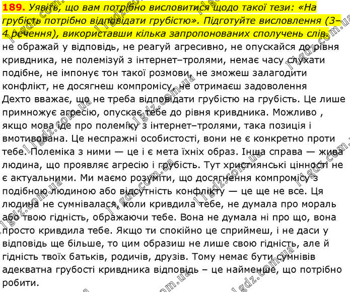 Уявіть, що вам потрібно висловитися щодо такої тези: «На грубість потрібно відповідати грубістю». Підготуйте висловлення (3–4 речення), використавши кілька запропонованих сполучень слів. не ображай у відповідь, не реагуй агресивно, не опускайся до рівня кривдника, не полемізуй з інтернет–тролями, немає часу слухати подібне, не імпонує тон такої розмови, не зможеш залагодити конфлікт, не досягнеш компромісу, не отримаєш задоволення Дехто вважає, що не треба відповідати грубістю на грубість. Це лише примножує агресію, опускає тебе до рівня кривдника. Можливо , якщо мова іде про полеміку з інтернет–тролями, така позиція і вмотивована. Це неспражні особистості, вони не є конкретно проти тебе. Полеміка з ними — це і є мета їхніх образ. Інша справа — жива людина, що проявляє агресію і грубість. Тут християнські цінності не є актуальними. Ми маємо розуміти, що досягнення компромісу з подібною людиною або відсутність конфлікту — це ще не все. Ця людина не сумнівалася, коли кривдила тебе, не думала про мораль або твою гідність, ображаючи тебе. Вона не думала ні про що, вона просто кривдила тебе. Якщо ти спокійно це сприймеш, і не даси у відповідь ще більше, то цим образиш не лише свою гідність, але й гідність твоїх батьків, родичів, друзів. Тому немає бути сумнівів адекватна грубості кривдника відповідь – це найменше, що потрібно робити.