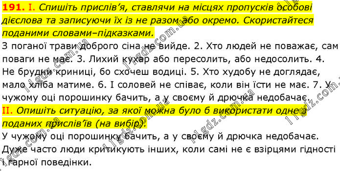І. Спишіть прислів’я, ставлячи на місцях пропусків особові дієслова та записуючи їх із не разом або окремо. Скористайтеся поданими словами–підказками. З поганої трави доброго сіна не вийде. 2. Хто людей не поважає, сам поваги не має. 3. Лихий кухар або пересолить, або недосолить. 4. Не брудни криниці, бо схочеш водиці. 5. Хто худобу не доглядає, мало хліба матиме. 6. І соловей не співає, коли він їсти не має. 7. У чужому оці порошинку бачить, а у своєму й дрючка недобачає. II. Опишіть ситуацію, за якої можна було б використати одне з поданих прислів’їв (на вибір). У чужому оці порошинку бачить, а у своєму й дрючка недобачає. Дуже часто люди критикують інших, коли самі не є взірцями гідності і гарної поведінки.