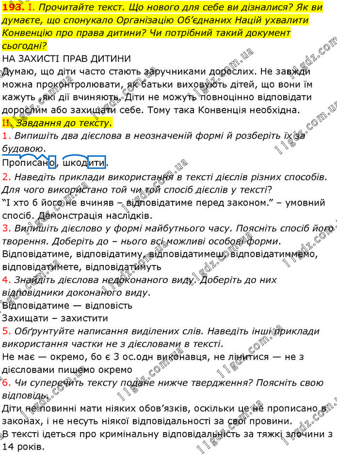 І. Прочитайте текст. Що нового для себе ви дізналися? Як ви думаєте, що спонукало Організацію Об’єднаних Націй ухвалити Конвенцію про права дитини? Чи потрібний такий документ сьогодні? НА ЗАХИСТІ ПРАВ ДИТИНИ Думаю, що діти часто стають заручниками дорослих. Не завжди можна проконтролювати, як батьки виховують дітей, що вони їм кажуть ,які дії вчиняють. Діти не можуть повноцінно відповідати дорослим або захищати себе. Тому така Конвенція необхідна. II. Завдання до тексту. 1. Випишіть два дієслова в неозначеній формі й розберіть їх за будовою. Прописано, шкодити. 2. Наведіть приклади використання в тексті дієслів різних способів. Для чого використано той чи той спосіб дієслів у тексті? “І хто б його не вчиняв – відповідатиме перед законом.” – умовний спосіб. Демонстрація наслідків. 3. Випишіть дієслово у формі майбутнього часу. Поясніть спосіб його творення. Доберіть до – нього всі можливі особові форми. Відповідатиме, відповідатиму, відповідатимеш, відповідатиммемо, відповідатимете, відповідатимуть 4. Знайдіть дієслова недоконаного виду. Доберіть до них відповідники доконаного виду. Відповідатиме — відповість Захищати – захистити 5. Обґрунтуйте написання виділених слів. Наведіть інші приклади використання частки не з дієсловами в тексті. Не має — окремо, бо є 3 ос.одн виконавця, не лінитися — не з дієсловами пишемо окремо 6. Чи суперечить тексту подане нижче твердження? Поясніть свою відповідь. Діти не повинні мати ніяких обов’язків, оскільки це не прописано в законах, і не несуть ніякої відповідальності за свої провини. В тексті ідеться про кримінальну відповідальність за тяжкі злочини з 14 років.