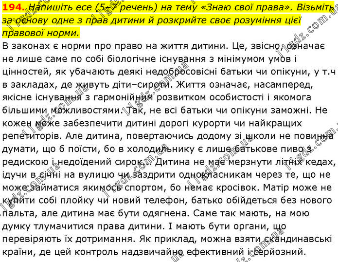 Напишіть есе (5–7 речень) на тему «Знаю свої права». Візьміть за основу одне з прав дитини й розкрийте своє розуміння цієї правової норми. В законах є норми про право на життя дитини. Це, звісно, означає не лише саме по собі біологічне існування з мінімумом умов і цінностей, як убачають деякі недобросовісні батьки чи опікуни, у т.ч в закладах, де живуть діти–сироти. Життя означає, насамперед, якісне існування з гармонійним розвитком особистості і якомога більшими можливостями. Так, не всі батьки чи опікуни заможні. Не кожен може забезпечити дитині дорогі курорти чи найкращих репетиторів. Але дитина, повертаючись додому зі школи не повинна думати, що б поїсти, бо в холодильнику є лише батькове пиво з редискою і недоїдений сирок... Дитина не має мерзнути літніх кедах, ідучи в січні на вулицю чи заздрити однокласникам через те, що не може займатися якимось спортом, бо немає кросівок. Матір може не купити собі плойку чи новий телефон, батько обійдеться без нового пальта, але дитина має бути одягнена. Саме так мають, на мою думку тлумачитися права дитини. І мають бути органи, що перевіряють їх дотримання. Як приклад, можна взяти скандинавські країни, де цей контроль надзвичайно ефективний і серйозний.