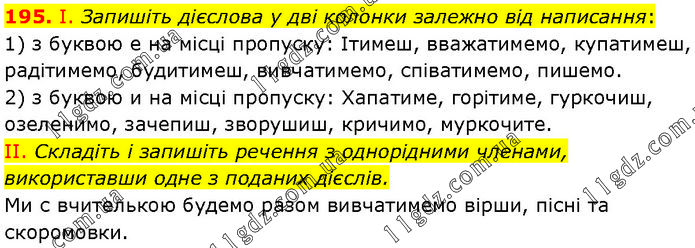 І. Запишіть дієслова у дві колонки залежно від написання: 1) з буквою е на місці пропуску: Ітимеш, вважатимемо, купатимеш, радітимемо, будитимеш, вивчатимемо, співатимемо, пишемо. 2) з буквою и на місці пропуску: Хапатиме, горітиме, гуркочиш, озеленимо, зачепиш, зворушиш, кричимо, муркочите. II. Складіть і запишіть речення з однорідними членами, використавши одне з поданих дієслів. Ми с вчителькою будемо разом вивчатимемо вірши, пісні та скоромовки.