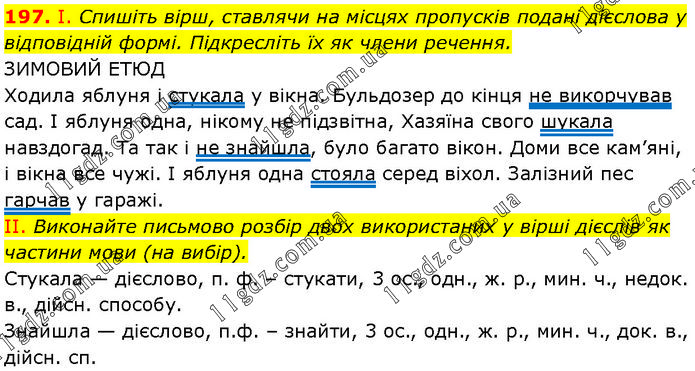 І. Спишіть вірш, ставлячи на місцях пропусків подані дієслова у відповідній формі. Підкресліть їх як члени речення. ЗИМОВИЙ ЕТЮД Ходила яблуня і стукала у вікна. Бульдозер до кінця не викорчував сад. І яблуня одна, нікому не підзвітна, Хазяїна свого шукала навздогад. Та так і не знайшла, було багато вікон. Доми все кам’яні, і вікна все чужі. І яблуня одна стояла серед віхол. Залізний пес гарчав у гаражі. II. Виконайте письмово розбір двох використаних у вірші дієслів як частини мови (на вибір). Стукала — дієслово, п. ф. – стукати, 3 ос., одн., ж. р., мин. ч., недок. в., дійсн. способу. Знайшла — дієслово, п.ф. – знайти, 3 ос., одн., ж. р., мин. ч., док. в., дійсн. сп.