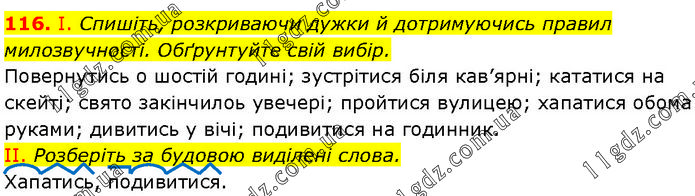 І. Спишіть, розкриваючи дужки й дотримуючись правил милозвучності. Обґрунтуйте свій вибір. Повернутись о шостій годині; зустрітися біля кав’ярні; кататися на скейті; свято закінчилоь увечері; пройтися вулицею; хапатися обома руками; дивитись у вічі; подивитися на годинник. II. Розберіть за будовою виділені слова. Хапатись, подивитися.