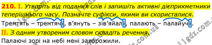 І. Утворіть від поданих слів і запишіть активні дієприкметники теперішнього часу. Позначте суфікси, якими ви скористалися. Тремтять – тремтячі, в’януть – зів’яйалі, палають – палайучі. II. З одним утвореним словом складіть речення. Палаючі зорі на небі мені заворожили.