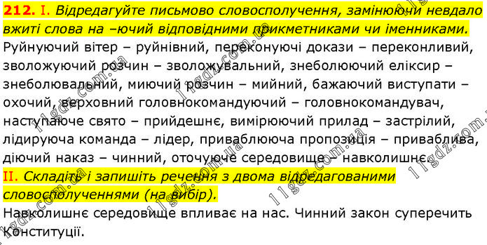 І. Відредагуйте письмово словосполучення, замінюючи невдало вжиті слова на –ючий відповідними прикметниками чи іменниками. Руйнуючий вітер – руйнівний, переконуючі докази – переконливий, зволожуючий розчин – зволожувальний, знеболюючий еліксир – знеболювальний, миючий розчин – мийний, бажаючий виступати – охочий, верховний головнокомандуючий – головнокомандувач, наступаюче свято – прийдешнє, вимірюючий прилад – застрілий, лідируюча команда – лідер, приваблююча пропозиція – приваблива, діючий наказ – чинний, оточуюче середовище – навколишнє. II. Складіть і запишіть речення з двома відредагованими словосполученнями (на вибір). Навколишнє середовище впливає на нас. Чинний закон суперечить Конституції.