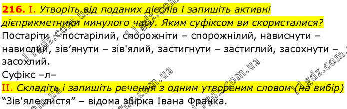 І. Утворіть від поданих дієслів і запишіть активні дієприкметники минулого часу. Яким суфіксом ви скористалися? Постаріти – постарілий, спорожніти – спорожнілий, нависнути – навислий, зів’янути – зів'ялий, застигнути – застиглий, засохнути – засохлий. Суфікс –л– II. Складіть і запишіть речення з одним утвореним словом (на вибір) “Зів'яле листя” – відома збірка Івана Франка.
