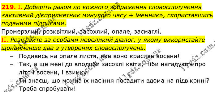 І. Доберіть разом до кожного зображення словосполучення «активний дієприкметник минулого часу + іменник», скориставшись поданими підписами. Промерзлий, розквітлий, засохлий, опале, засмаглі. II. Розіграйте за особами невеликий діалог, у якому використайте щонайменше два з утворених словосполучень. – Подивись на опале листя, яке воно красиве восени! – Так, а ще мені до вподоби засохлі квіти. Ніби нагадують про літо і восени, і взимку. – Ти знаєш, що можна їх насіння посадити вдома на підвіконні? – Треба спробувати!