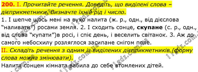 І. Прочитайте речення. Доведіть, що виділені слова – дієприкметники. Визначте їхній рід і число. 1. І шепче щось мені на вухо налита (ж. р., одн., від дієслова “наливати”) росами земля. 2. І сходить сонце, скупане (с. р., одн., від слова “купати”)в росі, і спіє день, і веселить світанок. 3. Аж до самого небосхилу розляглося засипане снігом поле. II. Складіть речення з одним із виділених дієприкметників (форму слова можна змінювати). Налита сонцем кімната вабила до себе втомлених дітей.