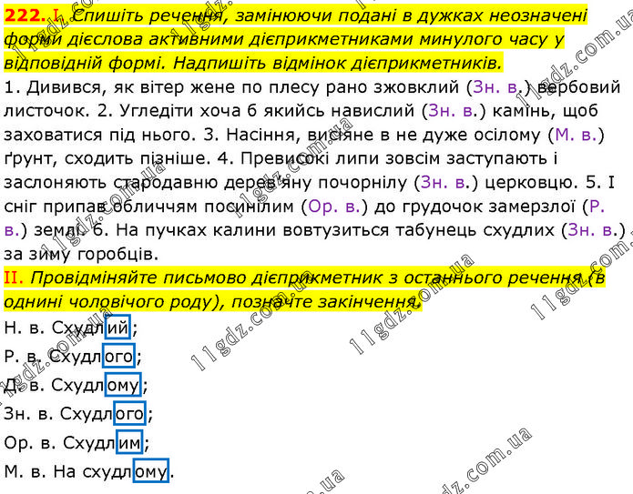 І. Спишіть речення, замінюючи подані в дужках неозначені форми дієслова активними дієприкметниками минулого часу у відповідній формі. Надпишіть відмінок дієприкметників. 1. Дивився, як вітер жене по плесу рано зжовклий (Зн. в.) вербовий листочок. 2. Угледіти хоча б якийсь навислий (Зн. в.) камінь, щоб заховатися під нього. 3. Насіння, висіяне в не дуже осілому (М. в.) ґрунт, сходить пізніше. 4. Превисокі липи зовсім заступають і заслоняють стародавню дерев’яну почорнілу (Зн. в.) церковцю. 5. І сніг припав обличчям посинілим (Ор. в.) до грудочок замерзлої (Р. в.) землі. 6. На пучках калини вовтузиться табунець схудлих (Зн. в.) за зиму горобців. II. Провідміняйте письмово дієприкметник з останнього речення (в однині чоловічого роду), позначте закінчення. Н. в. Схудлий; Р. в. Схудлого; Д. в. Схудлому; Зн. в. Схудлого; Ор. в. Схудлим; М. в. На схудлому.