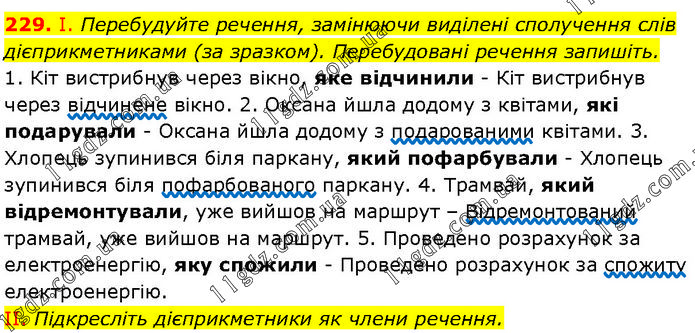 І. Перебудуйте речення, замінюючи виділені сполучення слів дієприкметниками (за зразком). Перебудовані речення запишіть. 1. Кіт вистрибнув через вікно, яке відчинили - Кіт вистрибнув через відчинене вікно. 2. Оксана йшла додому з квітами, які подарували - Оксана йшла додому з подарованими квітами. 3. Хлопець зупинився біля паркану, який пофарбували - Хлопець зупинився біля пофарбованого паркану. 4. Трамвай, який відремонтували, уже вийшов на маршрут – Відремонтований трамвай, уже вийшов на маршрут. 5. Проведено розрахунок за електроенергію, яку спожили - Проведено розрахунок за спожиту електроенергію. II. Підкресліть дієприкметники як члени речення.