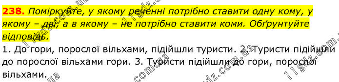 Поміркуйте, у якому реченні потрібно ставити одну кому, у якому – дві, а в якому – не потрібно ставити коми. Обґрунтуйте відповідь. 1. До гори, порослої вільхами, підійшли туристи. 2. Туристи підійшли до порослої вільхами гори. 3. Туристи підійшли до гори, порослої вільхами.