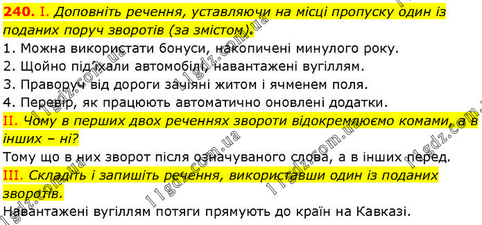 І. Доповніть речення, уставляючи на місці пропуску один із поданих поруч зворотів (за змістом). 1. Можна використати бонуси, накопичені минулого року. 2. Щойно під’їхали автомобілі, навантажені вугіллям. 3. Праворуч від дороги зачіяні житом і ячменем поля. 4. Перевір, як працюють автоматично оновлені додатки. II. Чому в перших двох реченнях звороти відокремлюємо комами, а в інших – ні? Тому що в них зворот після означуваного слова, а в інших перед. III. Складіть і запишіть речення, використавши один із поданих зворотів. Навантажені вугіллям потяги прямують до країн на Кавказі.