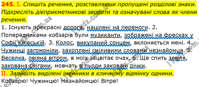 І. Спишіть речення, розставляючи пропущені розділові знаки. Підкресліть дієприкметникові звороти та означувані слова як члени речення. 1. Існують прекрасні дороги, націлені на перемоги. 2. Попередниками кобзарів були музиканти, зображені на фресках у Софії Київській. 3. Колос, викупаний сонцем, вклоняється мені. 4. Чужинці загомоніли, захоплені сміливими словами незнайомця. 5. Веселка, овіяна вітром, в моїх зацвітає очах. 6. Ще спить земля, закована снігами, мовчать в льоди заковані річки. II. Запишіть виділені іменники в кличному відмінку однини. Кобзарю! Чужинцю! Незнайомцю! Вітре!