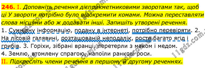 І. Доповніть речення дієприкметниковими зворотами так, щоб ці У звороти потрібно було відокремити комами. Можна переставляти слова місцями або ж додавати інші. Запишіть утворені речення. 1. Сумнівну інформацію, подану в інтернеті, потрібно перевіряти. 2. На лісовій галявині, розташованій неподалік, росте багато ягід і грибів. 3. Горіхи, зібрані вранці, перетерли з маком і медом. 4. Землю, втомлену спрагою, напоїли ранкові роси. II. Підкресліть члени речення в першому й другому реченнях.