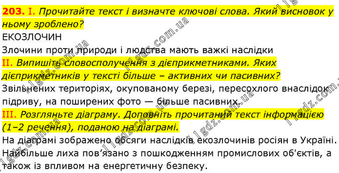 І. Прочитайте текст і визначте ключові слова. Який висновок у ньому зроблено? ЕКОЗЛОЧИН Злочини проти природи і людства мають важкі наслідки II. Випишіть словосполучення з дієприкметниками. Яких дієприкметників у тексті більше – активних чи пасивних? Звільнених територіях, окупованому березі, пересохлого внаслідок підриву, на поширених фото — більше пасивних. III. Розгляньте діаграму. Доповніть прочитаний текст інформацією (1–2 речення), поданою на діаграмі. На діаграмі зображено обсяги наслідків екозлочинів росіян в Україні. Найбільше лиха пов’язано з пошкодженням промислових об'єктів, а також із впливом на енергетичну безпеку.