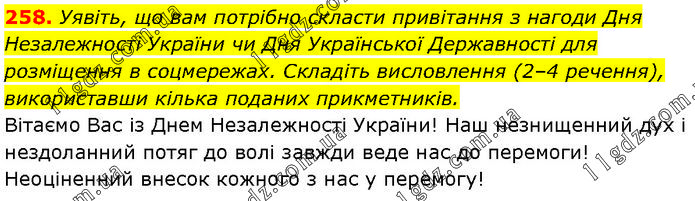 Уявіть, що вам потрібно скласти привітання з нагоди Дня Незалежності України чи Дня Української Державності для розміщення в соцмережах. Складіть висловлення (2–4 речення), використавши кілька поданих прикметників. Вітаємо Вас із Днем Незалежності України! Наш незнищенний дух і нездоланний потяг до волі завжди веде нас до перемоги! Неоціненний внесок кожного з нас у перемогу!