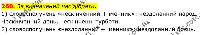 За визначений час дібрати. 1) словосполучень «нескінченний + іменник»: нездоланний народ. Нескінченний день, нескінченні турботи. 2) словосполучень «нездоланний + іменник»: нездоланний боєць.
