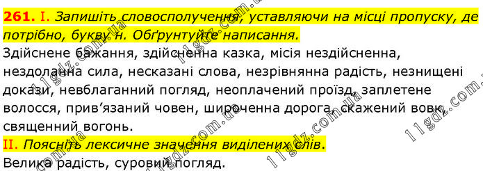 І. Запишіть словосполучення, уставляючи на місці пропуску, де потрібно, букву н. Обґрунтуйте написання. Здійснене бажання, здійсненна казка, місія нездійсненна, нездоланна сила, несказані слова, незрівнянна радість, незнищені докази, невблаганний погляд, неоплачений проїзд, заплетене волосся, прив’язаний човен, широченна дорога, скажений вовк, священний вогонь. II. Поясніть лексичне значення виділених слів. Велика радість, суровий погляд.