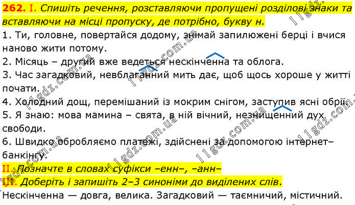 І. Спишіть речення, розставляючи пропущені розділові знаки та вставляючи на місці пропуску, де потрібно, букву н. 1. Ти, головне, повертайся додому, знімай запилюжені берці і вчися наново жити потому. 2. Місяць – другий вже ведеться нескінченна та облога. 3. Час загадковий, невблаганний мить дає, щоб щось хороше у житті почати. 4. Холодний дощ, перемішаний із мокрим снігом, заступив ясні обрії. 5. Я знаю: мова мамина – свята, в ній вічний, незнищенний дух свободи. 6. Швидко обробляємо платежі, здійснені за допомогою інтернет–банкінгу. II. Позначте в словах суфікси –енн–, –анн– III. Доберіть і запишіть 2–3 синоніми до виділених слів. Нескінченна — довга, велика. Загадковий — таємничий, містичний.