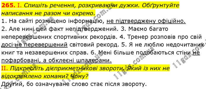 І. Спишіть речення, розкриваючи дужки. Обґрунтуйте написання не разом чи окремо. 1. На сайті розміщено інформацію, не підтверджену офіційно. 2. Але нині цей факт непідтверджений. 3. Маємо багато неперевершених спортивних рекордів. 4. Тренер розповів про свій досі не перевершений світовий рекорд. 5. Я не люблю недочитаних книг та незавершених справ. 6. Мені більше подобаються стіни не пофарбовані, а обклеєні шпалерами. II. Підкресліть дієприкметникові звороти. Який із них не відокремлено комами? Чому? Другий, бо означуване слово стає після звороту.