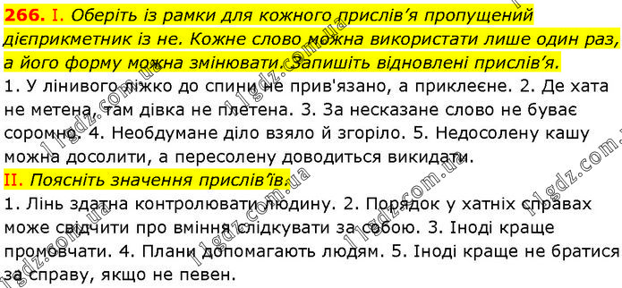 І. Оберіть із рамки для кожного прислів’я пропущений дієприкметник із не. Кожне слово можна використати лише один раз, а його форму можна змінювати. Запишіть відновлені прислів’я. 1. У лінивого ліжко до спини не прив'язано, а приклеєне. 2. Де хата не метена, там дівка не плетена. 3. За несказане слово не буває соромно. 4. Необдумане діло взяло й згоріло. 5. Недосолену кашу можна досолити, а пересолену доводиться викидати. II. Поясніть значення прислів’їв. 1. Лінь здатна контролювати людину. 2. Порядок у хатніх справах може свідчити про вміння слідкувати за собою. 3. Іноді краще промовчати. 4. Плани допомагають людям. 5. Іноді краще не братися за справу, якщо не певен.