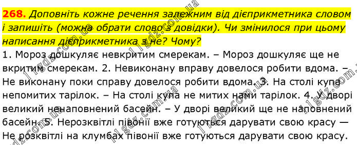 Доповніть кожне речення залежним від дієприкметника словом і запишіть (можна обрати слово з довідки). Чи змінилося при цьому написання дієприкметника з не? Чому? 1. Мороз дошкуляє невкритим смерекам. – Мороз дошкуляє ще не вкритим смерекам. 2. Невиконану вправу довелося робити вдома. – Не виконану поки справу довелося робити вдома. 3. На столі купа непомитих тарілок. – На столі купа не митих нами тарілок. 4. У дворі великий ненаповнений басейн. – У дворі великий ще не наповнений басейн. 5. Нерозквітлі півонії вже готуються дарувати свою красу — Не розквітлі на клумбах півонії вже готуються дарувати свою красу.