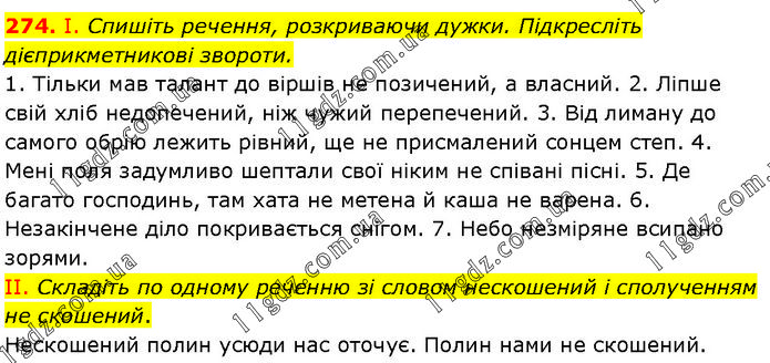 І. Спишіть речення, розкриваючи дужки. Підкресліть дієприкметникові звороти. 1. Тільки мав талант до віршів не позичений, а власний. 2. Ліпше свій хліб недопечений, ніж чужий перепечений. 3. Від лиману до самого обрію лежить рівний, ще не присмалений сонцем степ. 4. Мені поля задумливо шептали свої ніким не співані пісні. 5. Де багато господинь, там хата не метена й каша не варена. 6. Незакінчене діло покривається снігом. 7. Небо незміряне всипано зорями. II. Складіть по одному реченню зі словом нескошений і сполученням не скошений. Нескошений полин усюди нас оточує. Полин нами не скошений.