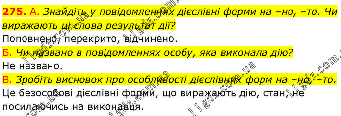 А. Знайдіть у повідомленнях дієслівні форми на –но, –то. Чи виражають ці слова результат дії? Поповнено, перекрито, відчинено. Б. Чи названо в повідомленнях особу, яка виконала дію? Не названо. В. Зробіть висновок про особливості дієслівних форм на –но, –то. Це безособові дієслівні форми, що виражають дію, стан, не посилаючись на виконавця.