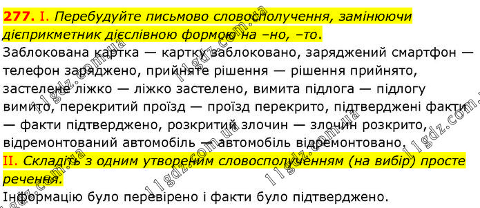 І. Перебудуйте письмово словосполучення, замінюючи дієприкметник дієслівною формою на –но, –то. Заблокована картка — картку заблоковано, заряджений смартфон — телефон заряджено, прийняте рішення — рішення прийнято, застелене ліжко — ліжко застелено, вимита підлога — підлогу вимито, перекритий проїзд — проїзд перекрито, підтверджені факти — факти підтверджено, розкритий злочин — злочин розкрито, відремонтований автомобіль — автомобіль відремонтовано. II. Складіть з одним утвореним словосполученням (на вибір) просте речення. Інформацію було перевірено і факти було підтверджено.