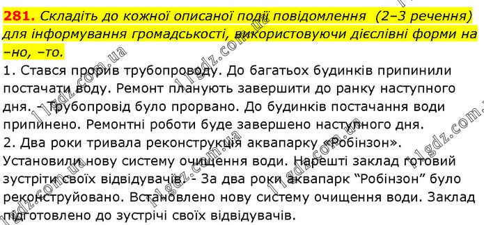 Складіть до кожної описаної події повідомлення (2–3 речення) для інформування громадськості, використовуючи дієслівні форми на –но, –то. 1. Стався прорив трубопроводу. До багатьох будинків припинили постачати воду. Ремонт планують завершити до ранку наступного дня. - Трубопровід було прорвано. До будинків постачання води припинено. Ремонтні роботи буде завершено наступного дня. 2. Два роки тривала реконструкція аквапарку «Робінзон». Установили нову систему очищення води. Нарешті заклад готовий зустріти своїх відвідувачів. - За два роки аквапарк “Робінзон” було реконструйовано. Встановлено нову систему очищення води. Заклад підготовлено до зустрічі своїх відвідувачів.