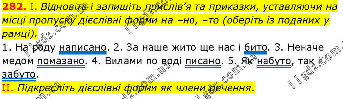 І. Відновіть і запишіть прислів’я та приказки, уставляючи на місці пропуску дієслівні форми на –но, –то (оберіть із поданих у рамці). 1. На роду написано. 2. За наше жито ще нас і бито. 3. Неначе медом помазано. 4. Вилами по воді писано. 5. Як набуто, так і забуто. II. Підкресліть дієслівні форми як члени речення.