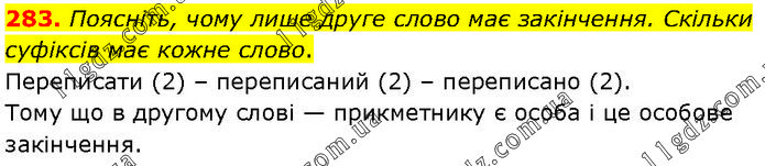 Поясніть, чому лише друге слово має закінчення. Скільки суфіксів має кожне слово. Переписати (2) – переписаний (2) – переписано (2). Тому що в другому слові — прикметнику є особа і це особове закінчення.