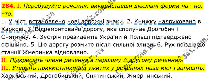 І. Перебудуйте речення, використавши дієслівні форми на –но, –то. 1. У місті встановлено нові дорожні знаки. 2. Книжку надруковано в Харкові. 3. Відремонтовано дорогу, яка сполучає Дрогобич і Снятинку. 4. Зустріч президентів України й Польщі підтверджено офіційно. 5. Цю дорогу розмито після сильної зливи. 6. Рух поїздів до станції Жмеринка відновлено. II. Підкресліть члени речення в першому й другому реченнях. III. Утворіть прикметники від ужитих у реченнях назв міст і запишіть. Харківський, Дрогобицький, Снятинський, Жмернинський.