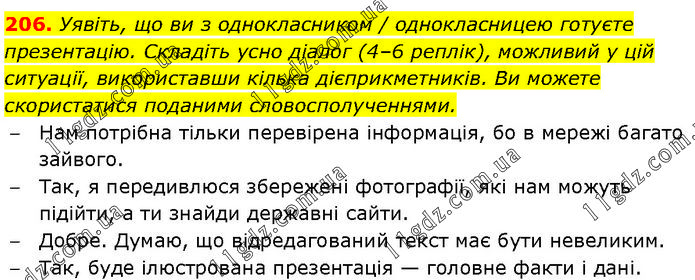 Уявіть, що ви з однокласником / однокласницею готуєте презентацію. Складіть усно діалог (4–6 реплік), можливий у цій ситуації, використавши кілька дієприкметників. Ви можете скористатися поданими словосполученнями. – Нам потрібна тільки перевірена інформація, бо в мережі багато зайвого. – Так, я передивлюся збережені фотографії, які нам можуть підійти, а ти знайди державні сайти. – Добре. Думаю, що відредагований текст має бути невеликим. – Так, буде ілюстрована презентація — головне факти і дані.