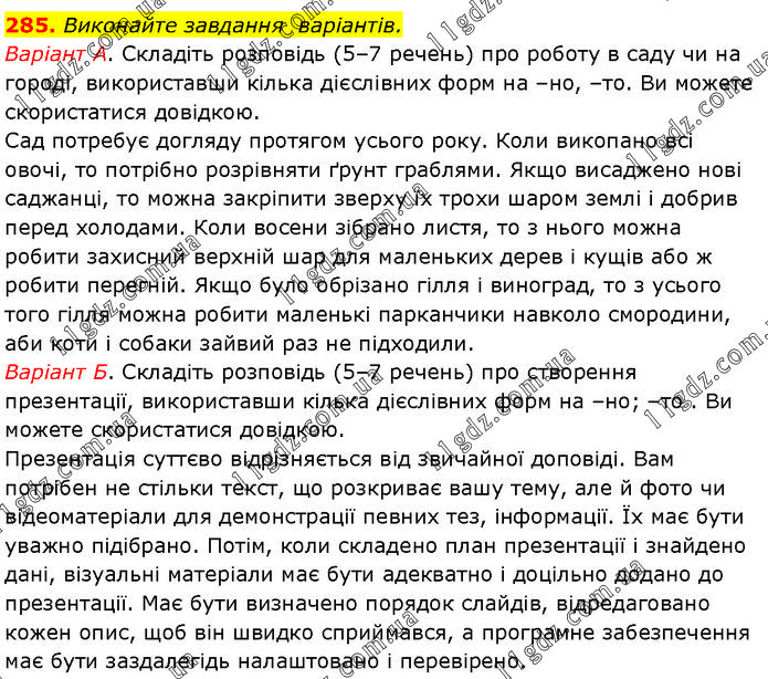 Виконайте завдання варіантів. Варіант А. Складіть розповідь (5–7 речень) про роботу в саду чи на городі, використавши кілька дієслівних форм на –но, –то. Ви можете скористатися довідкою. Сад потребує догляду протягом усього року. Коли викопано всі овочі, то потрібно розрівняти ґрунт граблями. Якщо висаджено нові саджанці, то можна закріпити зверху їх трохи шаром землі і добрив перед холодами. Коли восени зібрано листя, то з нього можна робити захисний верхній шар для маленьких дерев і кущів або ж робити перегній. Якщо було обрізано гілля і виноград, то з усього того гілля можна робити маленькі парканчики навколо смородини, аби коти і собаки зайвий раз не підходили. Варіант Б. Складіть розповідь (5–7 речень) про створення презентації, використавши кілька дієслівних форм на –но; –то . Ви можете скористатися довідкою. Презентація суттєво відрізняється від звичайної доповіді. Вам потрібен не стільки текст, що розкриває вашу тему, але й фото чи відеоматеріали для демонстрації певних тез, інформації. Їх має бути уважно підібрано. Потім, коли складено план презентації і знайдено дані, візуальні матеріали має бути адекватно і доцільно додано до презентації. Має бути визначено порядок слайдів, відредаговано кожен опис, щоб він швидко сприймався, а програмне забезпечення має бути заздалегідь налаштовано і перевірено.