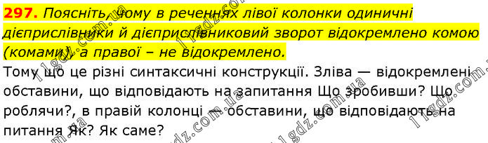 Поясніть, чому в реченнях лівої колонки одиничні дієприслівники й дієприслівниковий зворот відокремлено комою (комами), а правої – не відокремлено. Тому що це різні синтаксичні конструкції. Зліва — відокремлені обставини, що відповідають на запитання Що зробивши? Що роблячи?, в правій колонці — обставини, що відповідають на питання Як? Як саме?