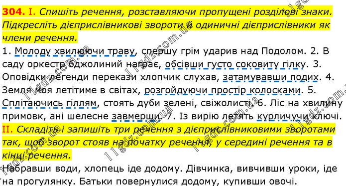 І. Спишіть речення, розставляючи пропущені розділові знаки. Підкресліть дієприслівникові звороти й одиничні дієприслівники як члени речення. 1. Молоду хвилюючи траву, спершу грім ударив над Подолом. 2. В саду оркестр бджолиний награє, обсівши густо соковиту гілку. 3. Оповідки легенди перекази хлопчик слухав, затамувавши подих. 4. Земля моя летітиме в світах, розгойдуючи простір колосками. 5. Сплітаючись гіллям, стоять дуби зелені, свіжолисті. 6. Ліс на хвилину примовк, ані шелесне завмерши. 7. Із вирію летять курличучи ключі. II. Складіть і запишіть три речення з дієприслівниковими зворотами так, щоб зворот стояв на початку речення, у середині речення та в кінці речення. Набравши води, хлопець іде додому. Дівчинка, вивчивши уроки, іде на прогулянку. Батьки повернулися додому, купивши овочі.