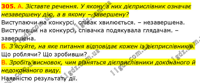 А. Зіставте речення. У якому з них дієприслівник означає незавершену дію, а в якому – завершену? Виступаючи на конкурсі, співак хвилюється. – незавершена. Виступивши на конкурсі, співачка подякувала глядачам. – завершена. Б. З’ясуйте, на яке питання відповідає кожен із дієприслівників. Що роблячи? Що зробивши? В. Зробіть висновок, чим різняться дієприслівники доконаного й недоконаного виду. Наявністю результату дії.