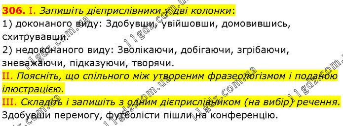 І. Запишіть дієприслівники у дві колонки: 1) доконаного виду: Здобувши, увійшовши, домовившись, схитрувавши. 2) недоконаного виду: Зволікаючи, добігаючи, згрібаючи, зневажаючи, підказуючи, творячи. II. Поясніть, що спільного між утвореним фразеологізмом і поданою ілюстрацією. III. Складіть і запишіть з одним дієприслівником (на вибір) речення. Здобувши перемогу, футболісти пішли на конференцію.