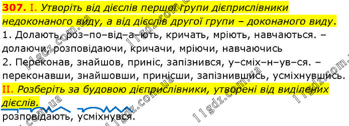 І. Утворіть від дієслів першої групи дієприслівники недоконаного виду, а від дієслів другої групи – доконаного виду. 1. Долають, роз–по–від–а–ють, кричать, мріють, навчаються. – долаючи, розповідаючи, кричачи, мріючи, навчаючись 2. Переконав, знайшов, приніс, запізнився, у–сміх–н–ув–ся. – переконавши, знайшовши, принісши, запізнившись, усміхнувшись. II. Розберіть за будовою дієприслівники, утворені від виділених дієслів. розповідають, усміхнувся.