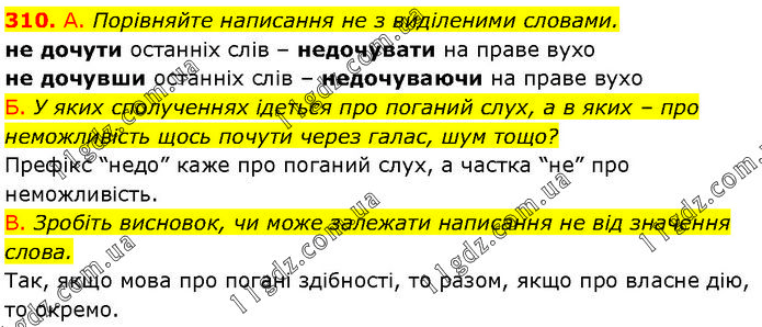 А. Порівняйте написання не з виділеними словами. не дочути останніх слів – недочувати на праве вухо не дочувши останніх слів – недочуваючи на праве вухо Б. У яких сполученнях ідеться про поганий слух, а в яких – про неможливість щось почути через галас, шум тощо? Префікс “недо” каже про поганий слух, а частка “не” про неможливість. В. Зробіть висновок, чи може залежати написання не від значення слова. Так, якщо мова про погані здібності, то разом, якщо про власне дію, то окремо.
