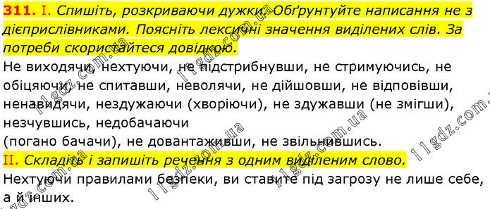 І. Спишіть, розкриваючи дужки. Обґрунтуйте написання не з дієприслівниками. Поясніть лексичні значення виділених слів. За потреби скористайтеся довідкою. Не виходячи, нехтуючи, не підстрибнувши, не стримуючись, не обіцяючи, не спитавши, неволячи, не дійшовши, не відповівши, ненавидячи, нездужаючи (хворіючи), не здужавши (не змігши), незчувшись, недобачаючи (погано бачачи), не довантаживши, не звільнившись. II. Складіть і запишіть речення з одним виділеним слово. Нехтуючи правилами безпеки, ви ставите під загрозу не лише себе, а й інших.