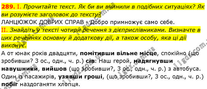 І. Прочитайте текст. Як би ви вчинили в подібних ситуаціях? Як ви розумієте заголовок до тексту? ЛАНЦЮЖОК ДОБРИХ СПРАВ - Добро примножує само себе. II. Знайдіть у тексті чотири речення з дієприслівниками. Визначте в цих реченнях основну й додаткову дії, а також особу, яка ці дії виконує. А от юнак років двадцяти, помітивши вільне місце, спокійно (що зробивши? 3 ос., одн., ч. р.) сів. Наш герой, надягнувши навушники, вийшов (що зробивши?, 3 ос., одн., ч. р.) з автобуса. Один із пасажирів, узявши гроші, (що зробивши?, 3 ос., одн., ч. р.) побіг наздоганяти хлопця.
