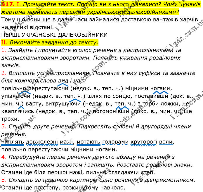 І. Прочитайте текст. Про що ви з нього дізналися? Чому чумаків жартома називають першими українськими далекобійниками? Тому що вони ще в давні часи займалися доставкою вантажів харчів на великі відстані. ПЕРШІ УКРАЇНСЬКІ ДАЛЕКОБІЙНИКИ II. Виконайте завдання до тексту. 1. Знайдіть і прочитайте вголос речення з дієприслівниками та дієприслівниковими зворотами. Поясніть уживання розділових знаків. 2. Випишіть усі дієприслівники. Позначте в них суфікси та зазначте біля кожного слова вид і час. повільно переступаючи (недок. в., теп. ч.) міцними ногами, упізнаючи (недок. в., теп. ч.) шлях по сонцю, поставивши (док. в., мин. ч.) варту, витрушуючи (недок. в., теп. ч.) з торби ложки, не кваплячись (недок. в., теп. ч.), погомонівши (доко. в., мин. ч.) ще трохи. 3. Спишіть друге речення. Підкресліть головні й другорядні члени речення. Риплять довжелезні мажі, мотають головами круторогі воли, повільно переступаючи міцними ногами. 4. Перебудуйте перше речення другого абзацу на речення з дієприслівниковим зворотом і запишіть. Розставте розділові знаки. Отаман іде біля першої мажі, пильно оглядаючи степ. 5. Складіть за поданою картиною одне речення з дієприкметником. Отаман іде по степу, розкинутому навколо.