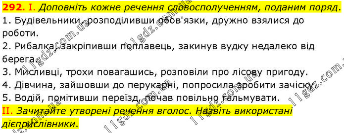 І. Доповніть кожне речення словосполученням, поданим поряд. 1. Будівельники, розподіливши обов'язки, дружно взялися до роботи. 2. Рибалка, закріпивши поплавець, закинув вудку недалеко від берега. 3. Мисливці, трохи повагашись, розповіли про лісову пригоду. 4. Дівчина, зайшовши до перукарні, попросила зробити зачіску. 5. Водій, помітивши переїзд, почав повільно гальмувати. II. Зачитайте утворені речення вголос. Назвіть використані дієприслівники.