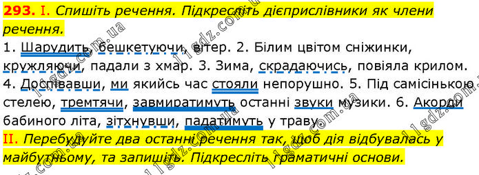 І. Спишіть речення. Підкресліть дієприслівники як члени речення. 1. Шарудить, бешкетуючи, вітер. 2. Білим цвітом сніжинки, кружляючи, падали з хмар. 3. Зима, скрадаючись, повіяла крилом. 4. Доспівавши, ми якийсь час стояли непорушно. 5. Під самісінькою стелею, тремтячи, завмиратимуть останні звуки музики. 6. Акорди бабиного літа, зітхнувши, падатимуть у траву. II. Перебудуйте два останні речення так, щоб дія відбувалась у майбутньому, та запишіть. Підкресліть граматичні основи.