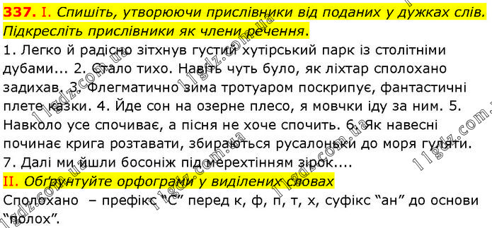 І. Спишіть, утворюючи прислівники від поданих у дужках слів. Підкресліть прислівники як члени речення. 1. Легко й радісно зітхнув густий хутірський парк із столітніми дубами... 2. Стало тихо. Навіть чуть було, як ліхтар сполохано задихав. 3. Флегматично зима тротуаром поскрипує, фантастичні плете казки. 4. Йде сон на озерне плесо, я мовчки іду за ним. 5. Навколо усе спочиває, а пісня не хоче спочить. 6. Як навесні починає крига розтавати, збираються русалоньки до моря гуляти. 7. Далі ми йшли босоніж під мерехтінням зірок.... II. Обґрунтуйте орфограми у виділених словах Сполохано – префікс “С” перед к, ф, п, т, х, суфікс “ан” до основи “полох”.