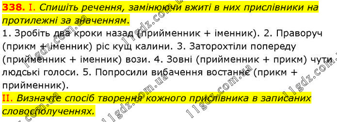 І. Спишіть речення, замінюючи вжиті в них прислівники на протилежні за значенням. 1. Зробіть два кроки назад (прийменник + іменник). 2. Праворуч (прикм + іменник) ріс кущ калини. 3. Заторохтіли попереду (прийменник + іменник) вози. 4. Зовні (прийменник + прикм) чути людські голоси. 5. Попросили вибачення востаннє (прикм + прийменник). II. Визначте спосіб творення кожного прислівника в записаних словосполученнях.